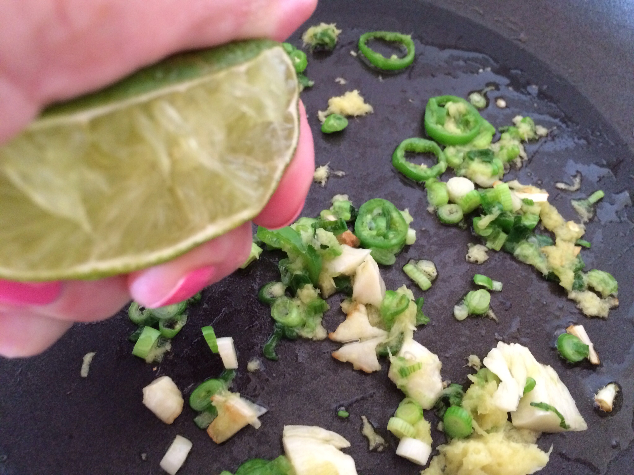 Move things round the pan a bit for a few minutes then add a good squeeze of lime juice.