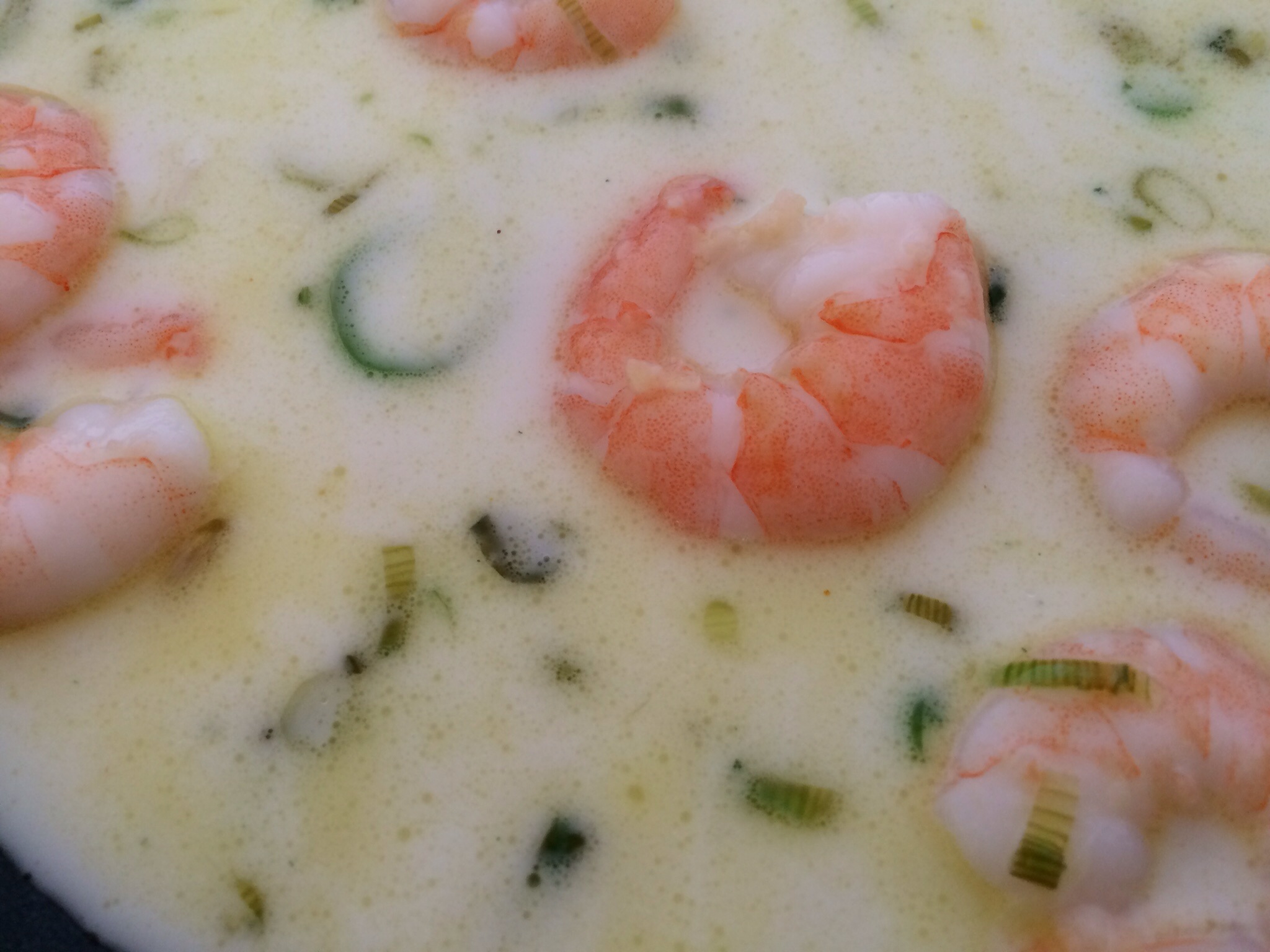 Add a small tin of coconut milk (or a third of a big tin – freeze the rest in an airtight container – we can use it later for Thai chicken curry), a small cup of chicken or veg stock and the prawns (I’m using about 6). If your prawns are raw then cook til they turn pink, otherwise cook them for a minute or 2.