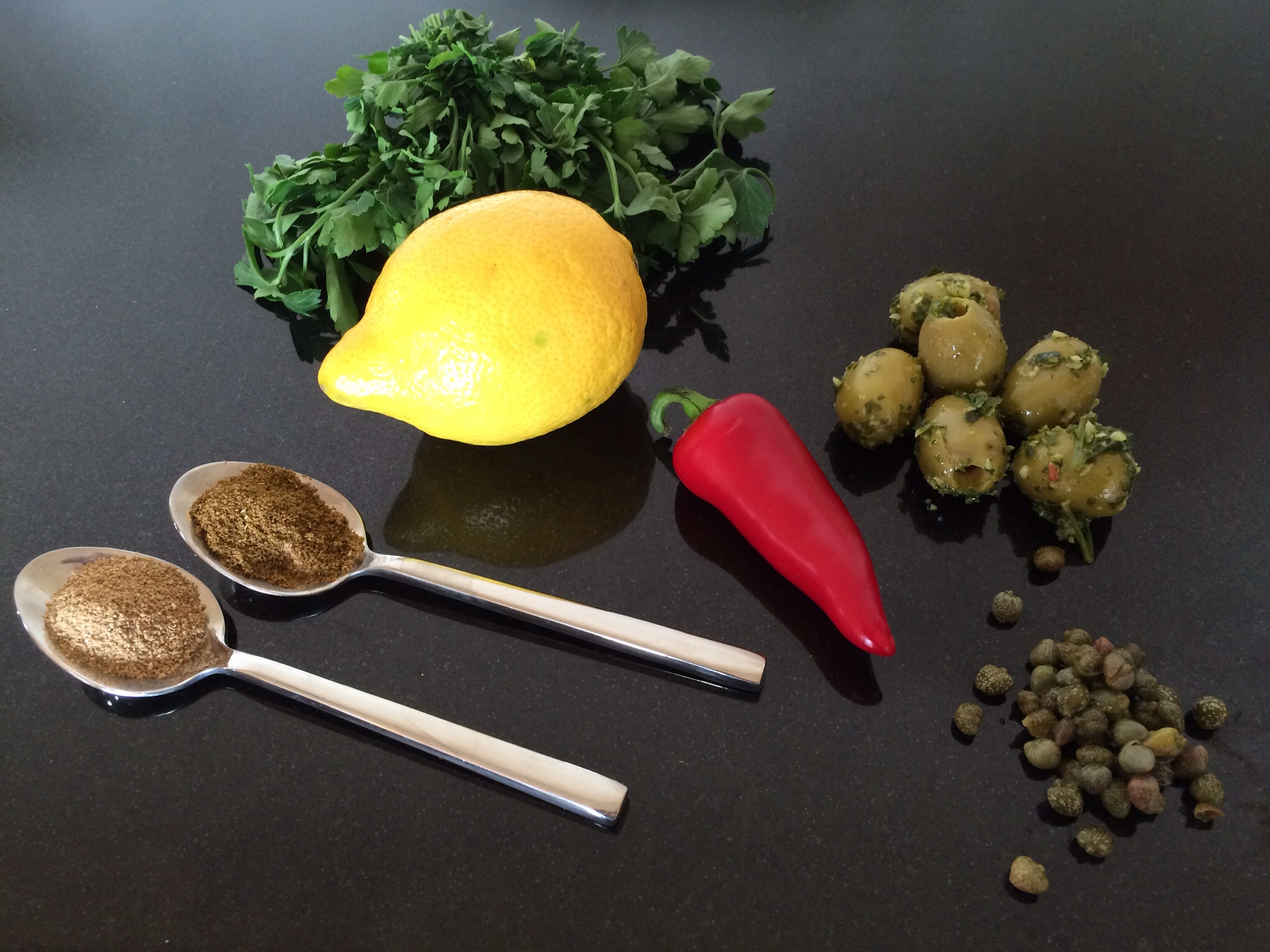 To make a dressing finely slice half a red chilli, 6 big pitted olives, 1 tbs of chopped capers. Add 3 tbs olive oil to the bowl and a good squeeze of lemon, salt and pepper and mix. Rub a little coriander and cumin powder over the skins of 2 sea bass fillets and pan fry over a medium heat for 5-6 minutes turning a few times and the skin is crispy.