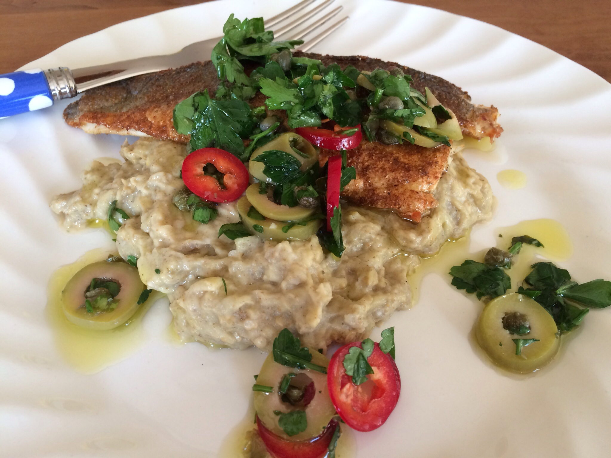 Aubergines chargrilled on the hob and then put in the oven for 40 minutes to soften. Do this the night before you want to serve it and it will only take as long as the fish takes to cook for supper to be ready.