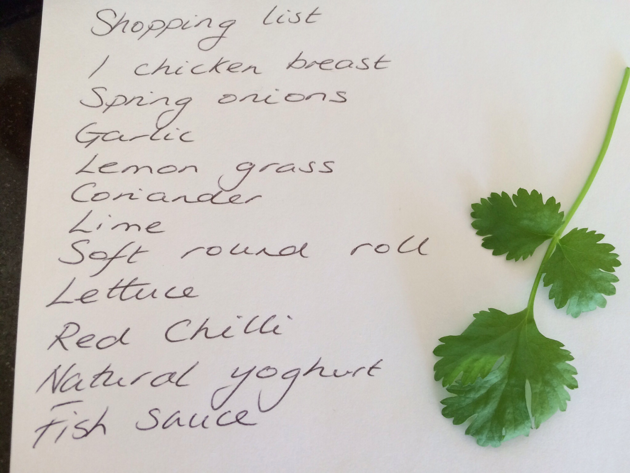 So just for one, blitz a chicken breast (skin off, in the blender). Then chop very finely half your garlic clove, a spring onion, half a red chilli, and really finely slice a very small amount of fresh lemon grass, like half a centimetre. (If you can’t lay your hands on any don’t worry it will all still be good.) Put those ingredients into a bowl add lime zest, a tsp of fish sauce, some snipped up coriander. Mix.