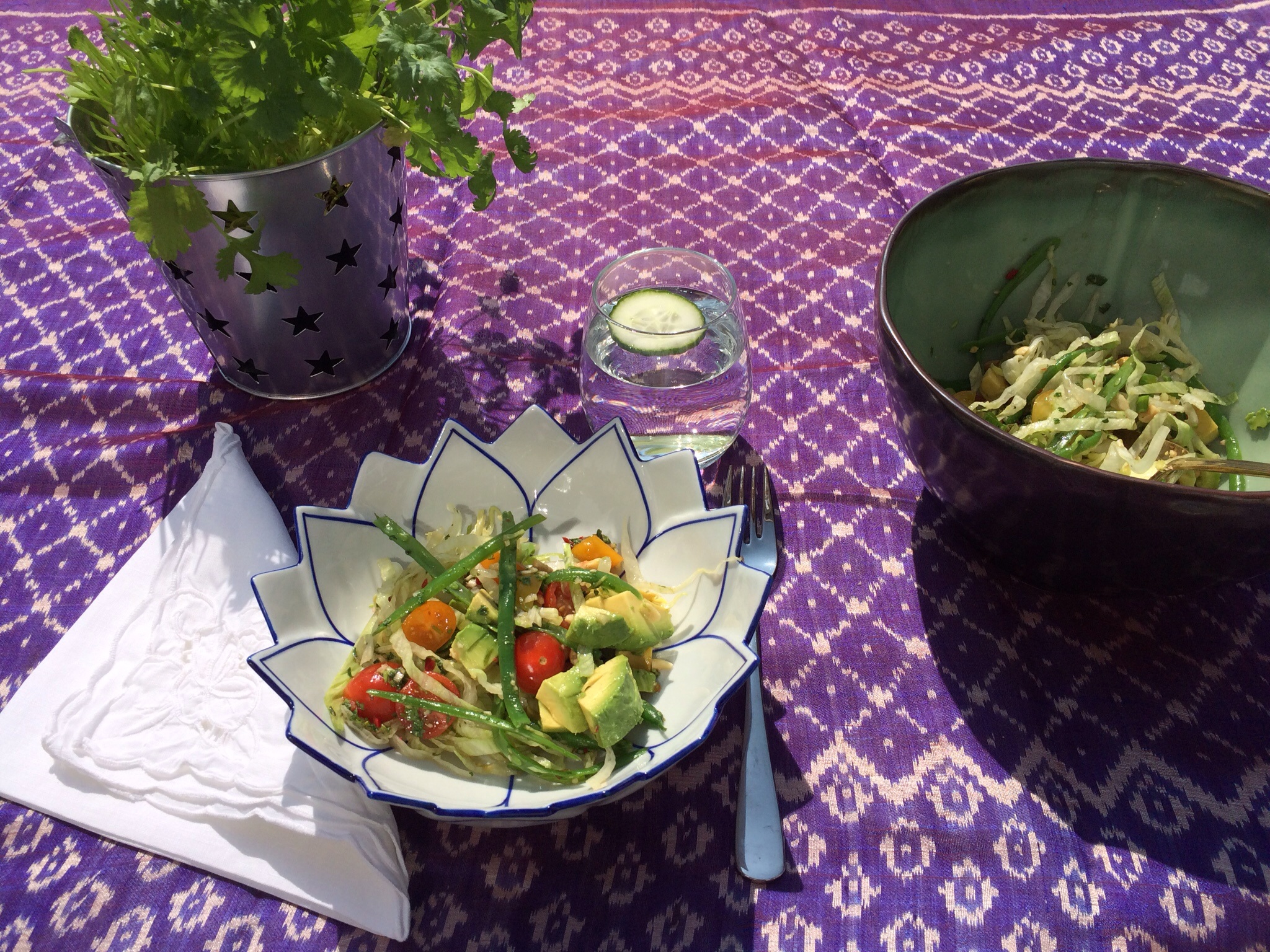 Finely slice half of an iceberg lettuce, chop up your tomatoes, your avocado, add the green beans and put the dressing on top. Snip up the spring onion onto the top. Mix everything together. Bash up a small handful of peanuts and add to the salad. I’m eating this on my own today but if you’re going to add some prawns or cooked fish this will serve 2 for a delicious light supper. Delicious!