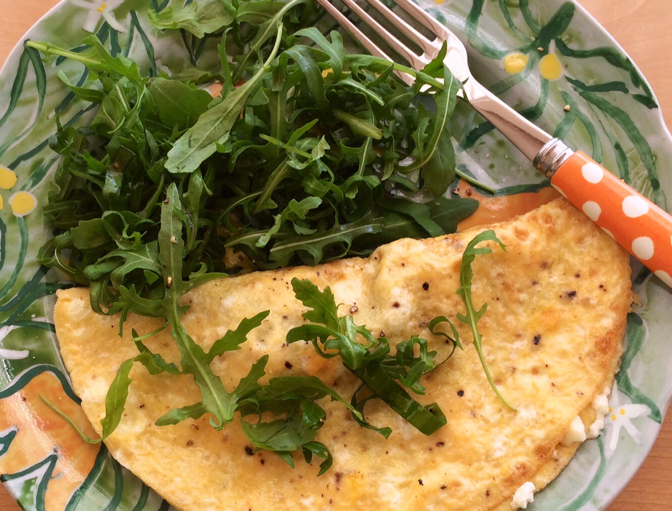 Wild garlic is growing now. It has a gentle oniony taste and works well in this omelette. I’ve added a few chopped leaves to a simple rocket salad too which I’ve drizzled with olive oil and a little lime juice. Delicious!