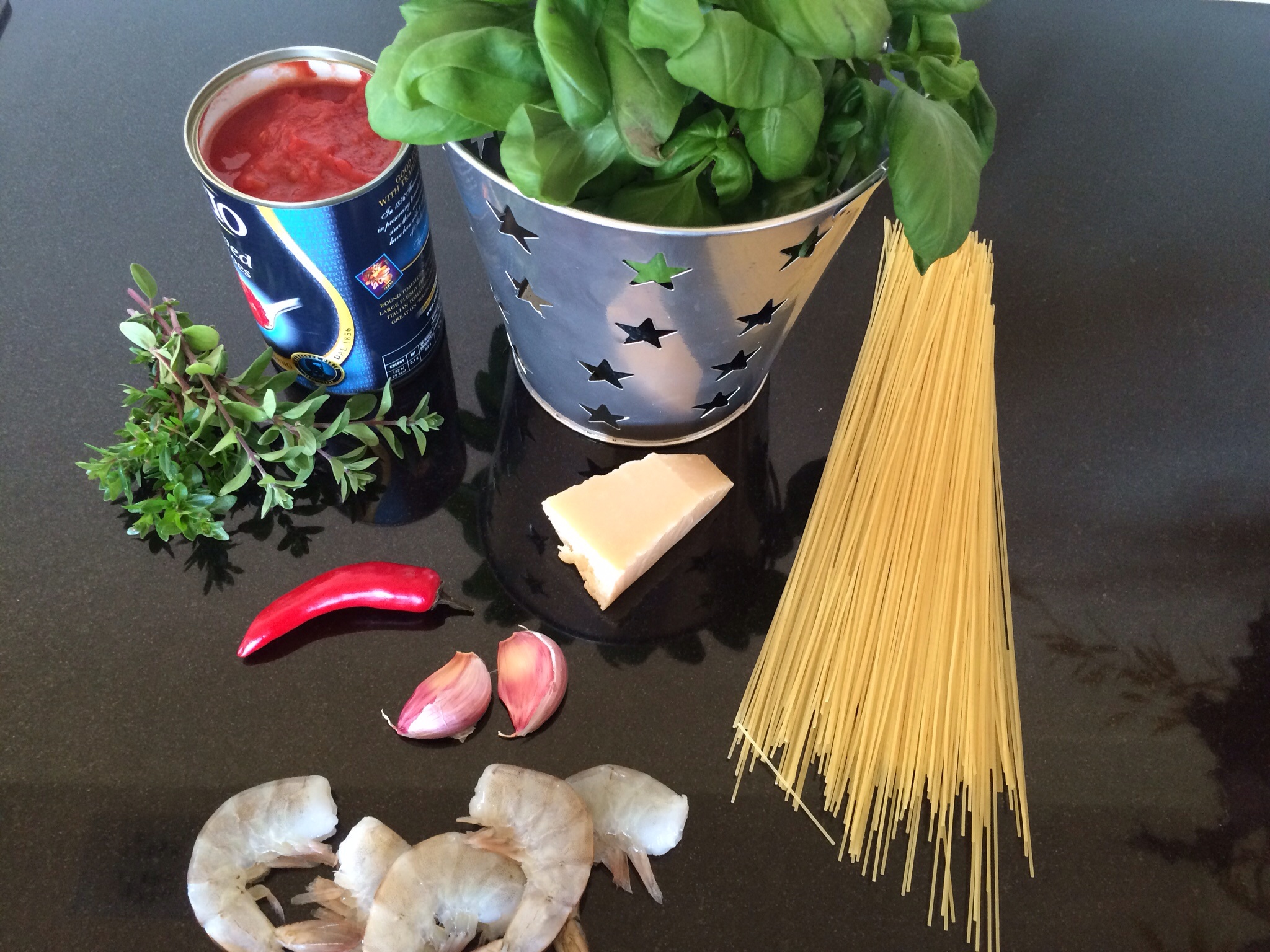 With the water from the kettle cook the pasta according to the instructions on the packet, approx 100g per person. The angel hair pasta takes about 3 minutes. So at that point throw the prawns into the tomato sauce. Shred a few basil leaves into the mix and gently stir everything together until the prawns are pink.