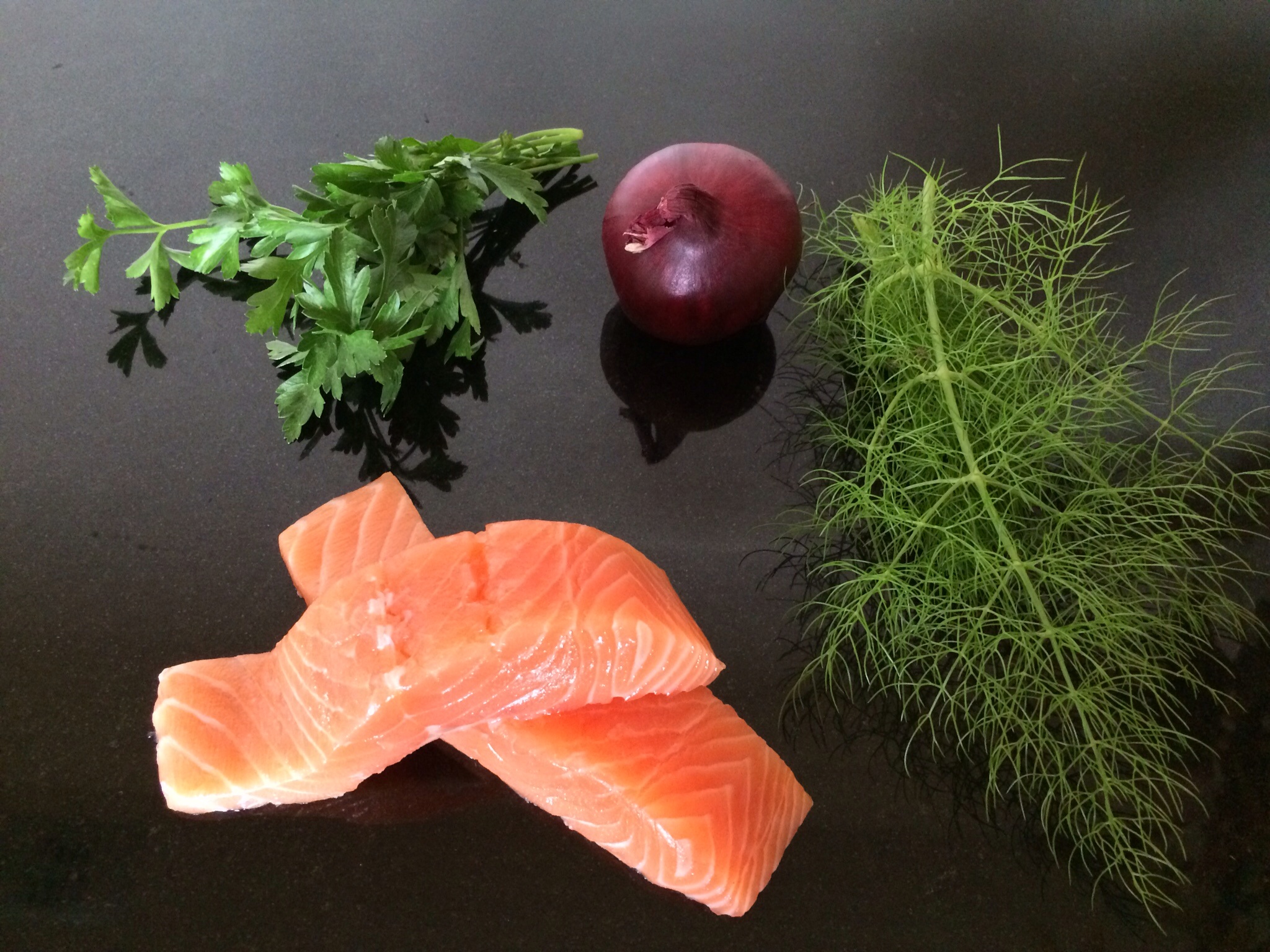 You’ll need a couple of salmon fillets, some fresh dill or fennel herb, some flat leaf parsley, a piece of onion, a few peppercorns, salt. For the dressing – some natural yoghurt, lemon zest and a drop of fresh lemon juice, salt and pepper. Put your skinned salmon fillets (using 2 here, either for 2 people tonight or keep one for lunch in a sarnie tomorrow) into a pan. Add a few peppercorns, some fresh fennel or dill, sea salt, a piece of onion. Cover completely with water. Bring to the boil and then simmer for about 4 minutes.