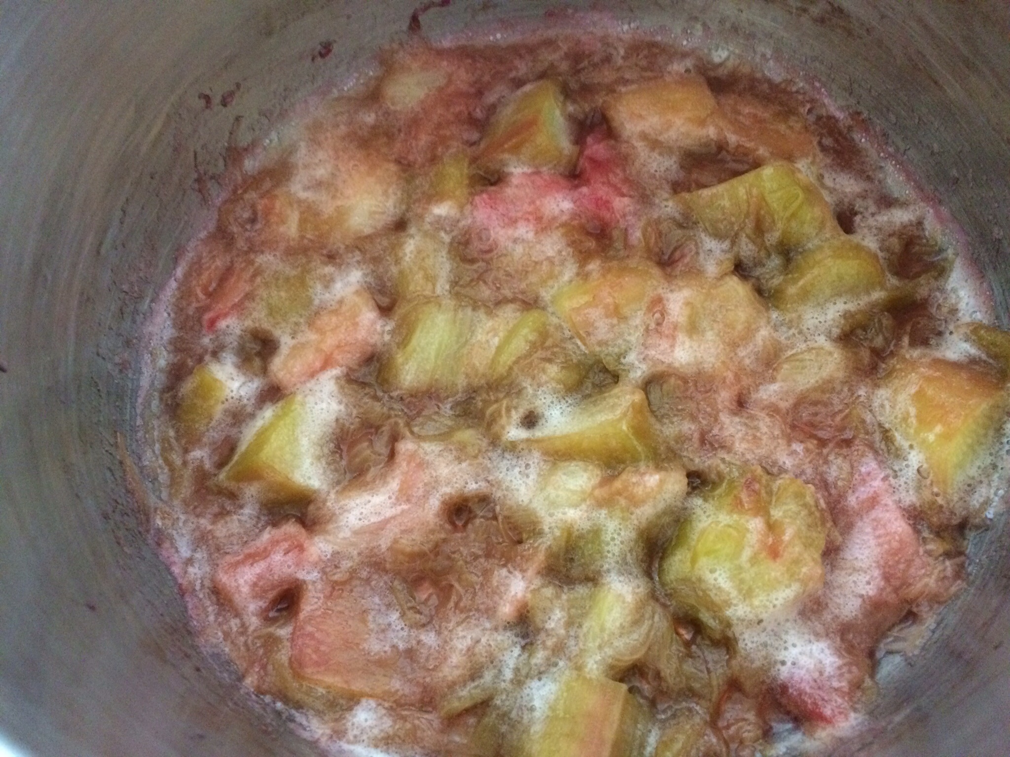 Put the oven on 190c. Wash the rhubarb and chop into small chunks. Place in the pan and cook gently with 3 stalks of fresh basil and 1 Tbs sugar or honey (I’m using local honey as a hayfever remedy), but check the sweetness as the rhubarb cooks, adding a little more sugar if you like. Add a little water as necessary as the fruit softens. When soft remove the basil stalks.