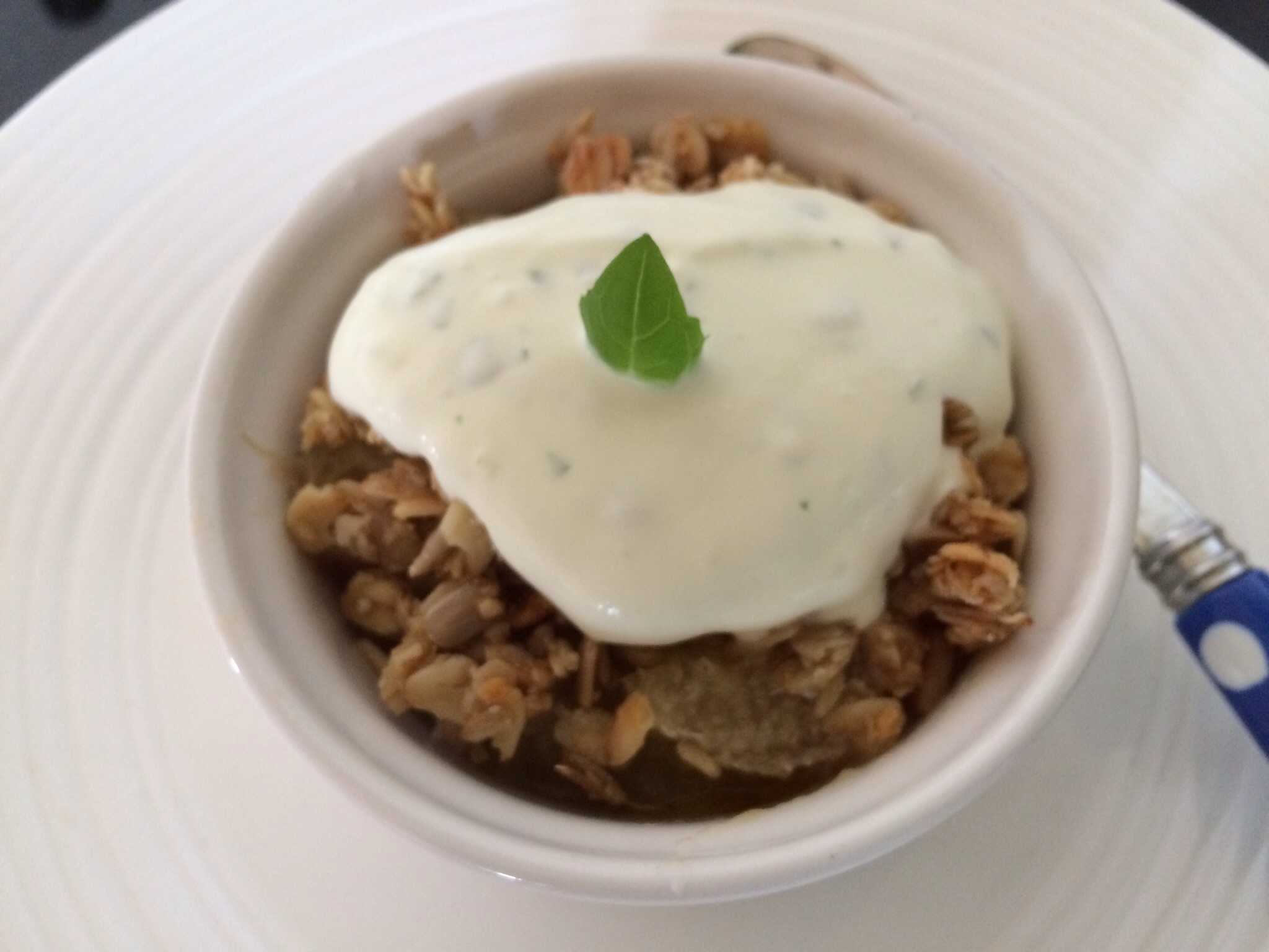 Make the cream. 4 Tbs of double cream whipped with a little caster sugar until it just holds it’s shape. Snip off about 6 – 8 basil leaves. Place one on top of the other and then roll them up together, snipping finely into the cream. Gently mix together. When the crumble is out of the oven spoon a dollop of cream on to each pudding.
