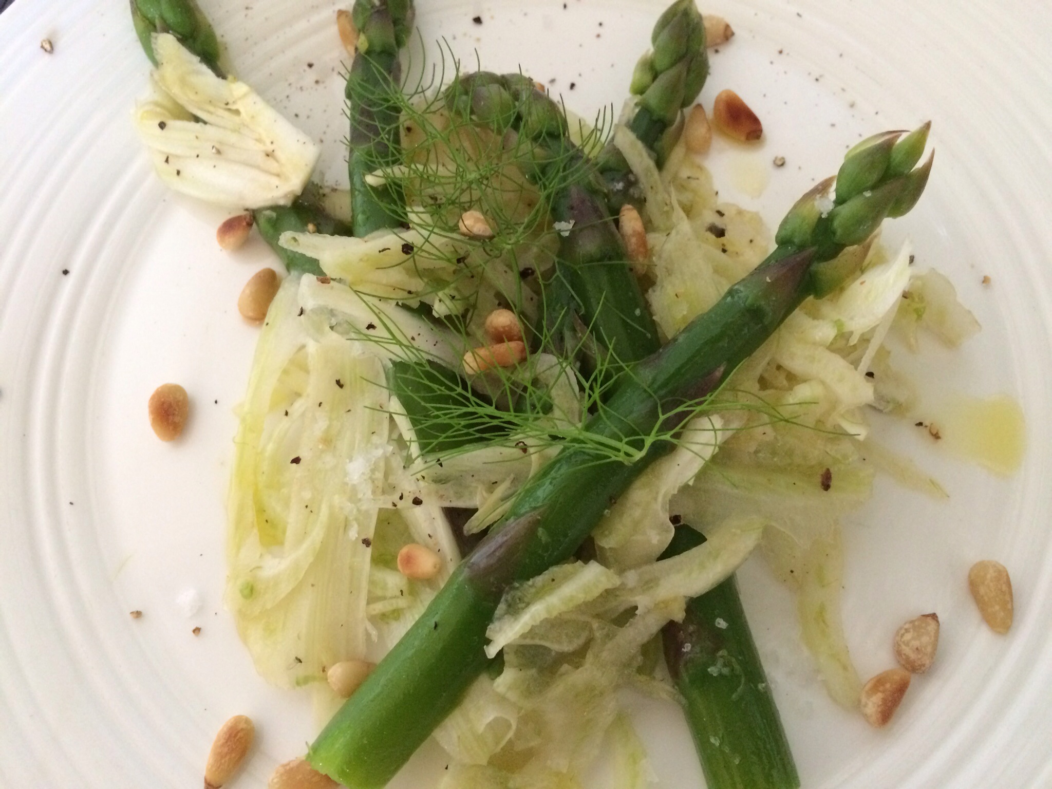 Super delicious, finely sliced fennel, quickly blanched English asparagus, with toasted pinenuts.