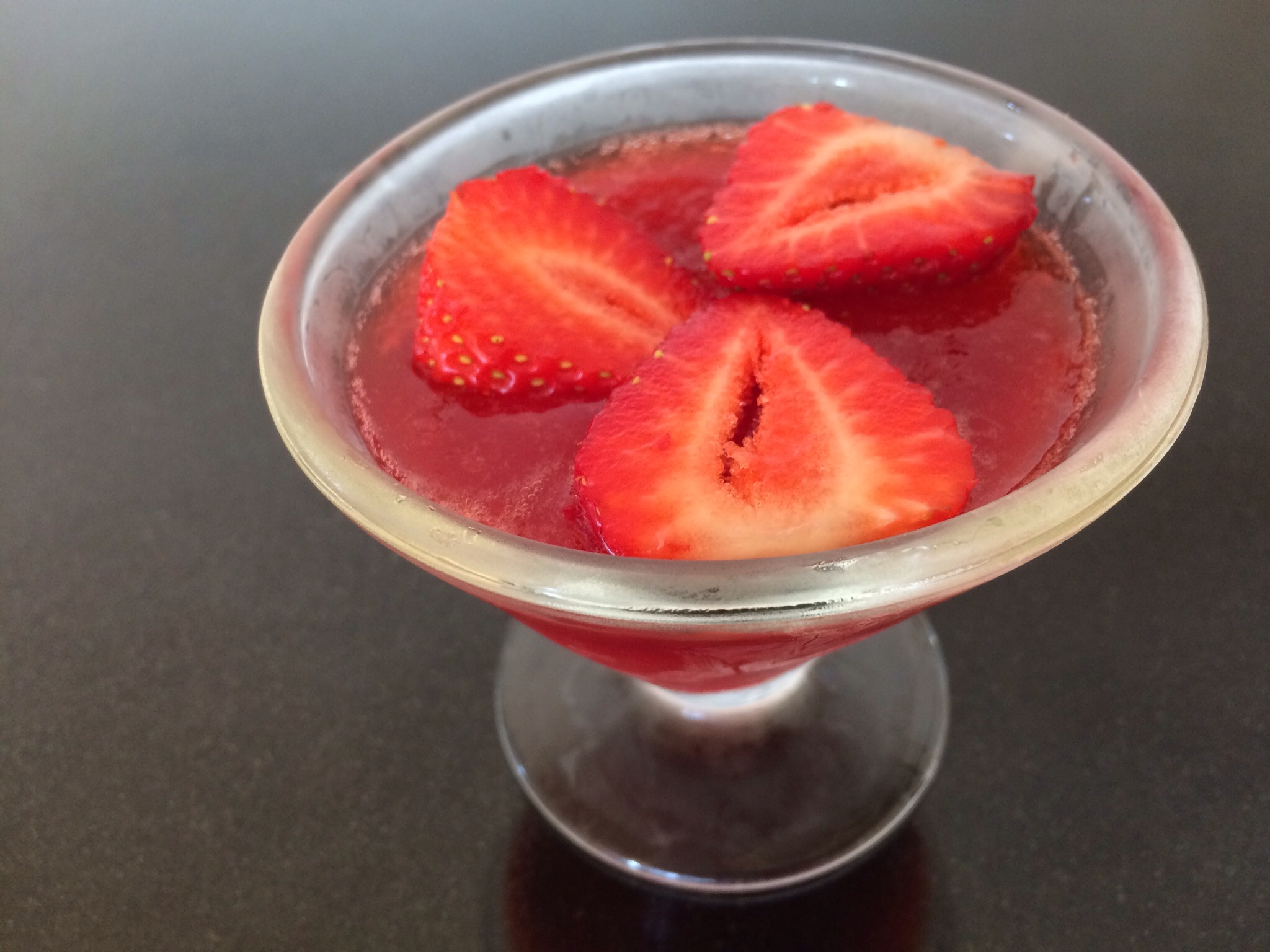 Pour into a couple of pretty glasses and chill for a couple of hours. Serve with some sliced strawberries on the top. I was surprised just how sweet and delicate this was, without the need for additional sugar. Delicious!