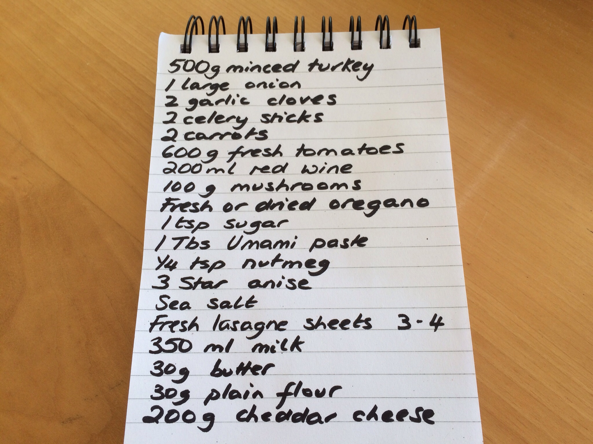 There are still tomatoes in the vegetable garden, and lots of carrots, onions and garlic to use along with fresh herbs. So I’m going to make a turkey lasagne, using some veg from the garden. I’ve also some Umami paste which is a great Japanese seasoning made with anchovies, black olives and parmesan, balsamic vinegar to name a few of the ingredients . It gives a really good depth of flavour to this dish. It is available at most large supermarkets and is really useful to add to so many dishes, from soups to roasts, so when you see it buy it!