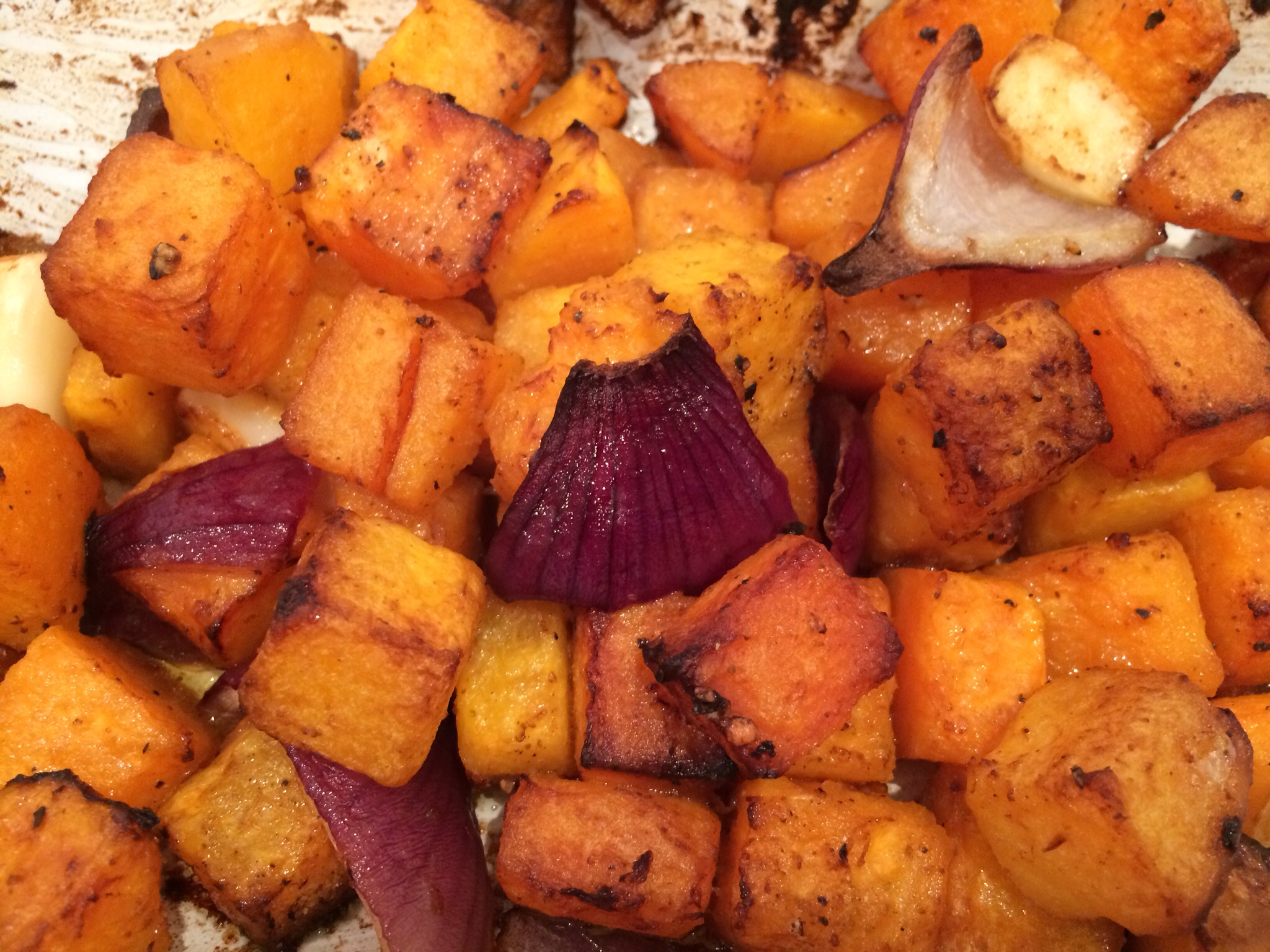 Put your oven on 200c fan. Drizzle approx 2 tablespoons of olive oil into a roasting tray and place in the oven. Peel the potato and chop into cubes. When the oil in the pan is hot add the potato and chopped onion and garlic (in it’s skin), salt and pepper. Mix the paprika, cinnamon and cumin powder and add to the potatoes, stir the potatoes around a little to coat with the spices. Roast in the oven for about 15-20 minutes until the cubes are soft and just starting to brown at the edges. Shake the tray half way through to move the potatoes around.