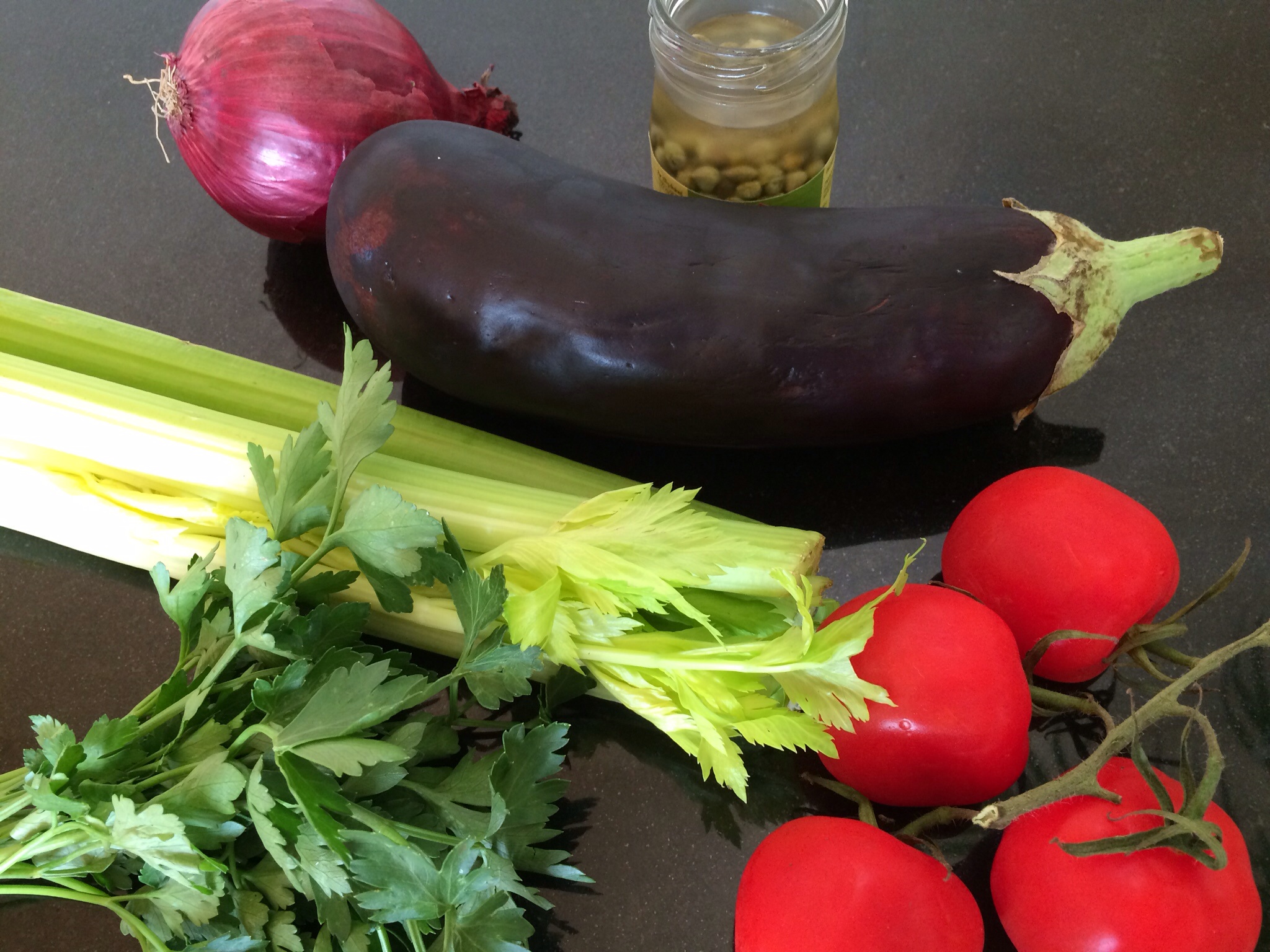 I’ve been reading this week about food waste. (See below the recipe for some surprising foodwaste facts.) Not wishing to add to the incredible amount of good food that hits the global waste bin, I have decided to use up a few rather sad looking vegetables from my fridge. So this recipe is a bit flexible based on on what was available. The main ingredients, aubergine, celery sticks, onion, tomatoes, olives are often hanging around in people’s fridges I think! Serves 4.