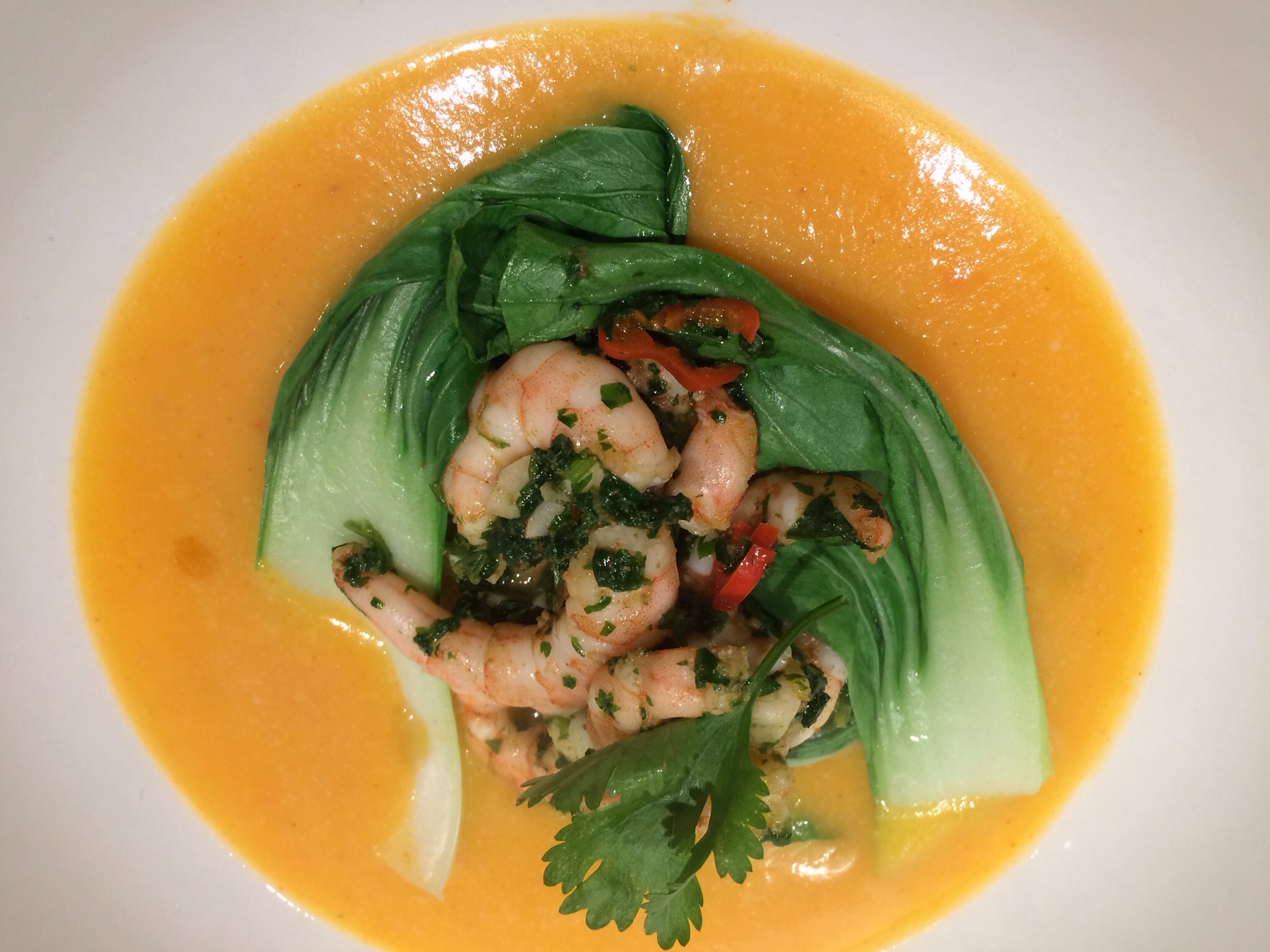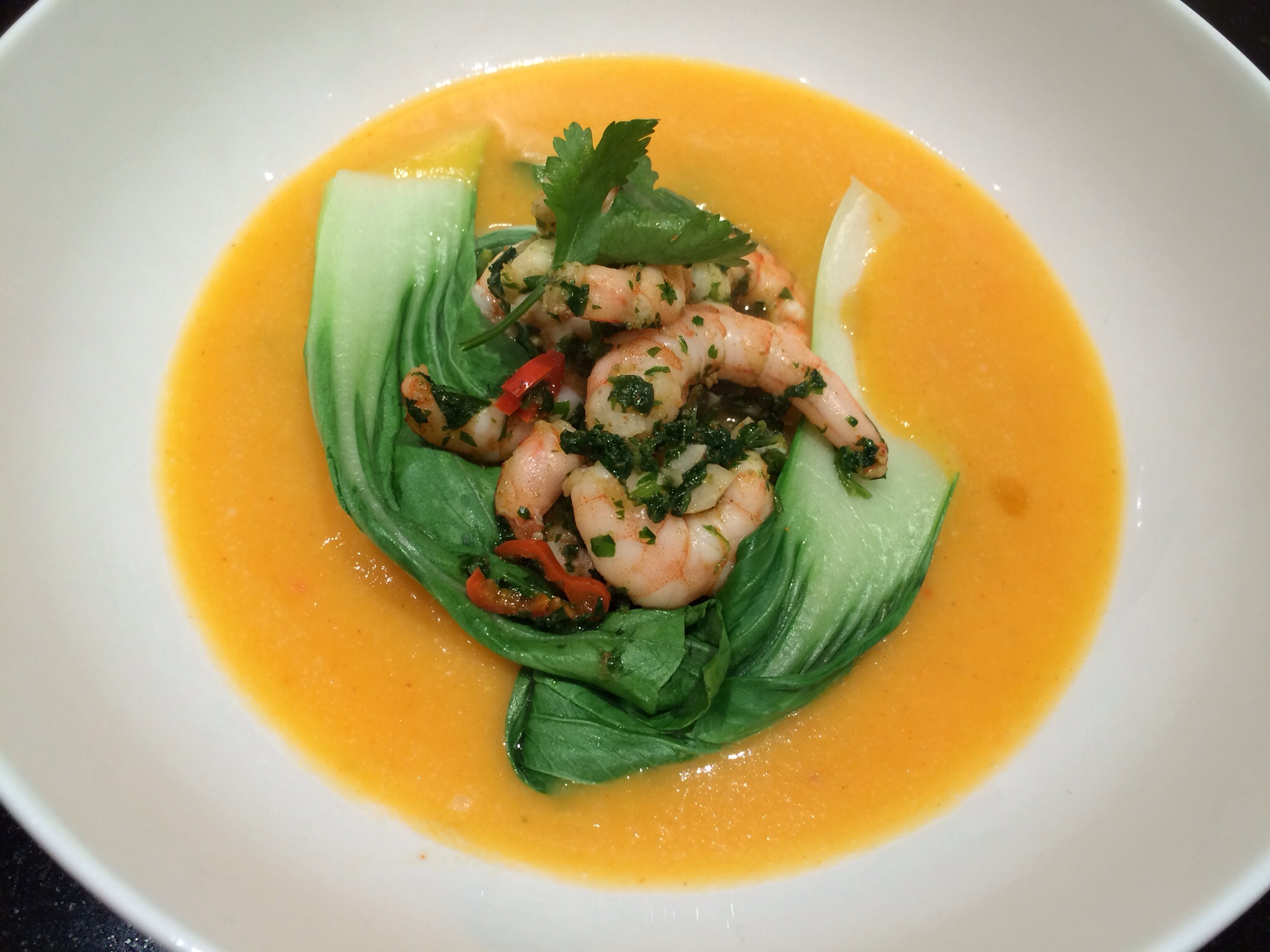 Nice and spicy for Firework Night and using up some leftover pumpkin from Halloween. While the broth simmers chop up some herb, chilli and garlic to quickly fry a few prawns.