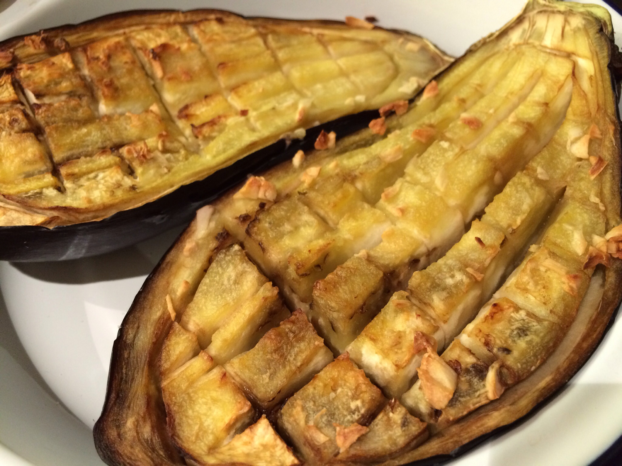 Heat the oven to 180c. Wash the aubergine. Carefully cut in half lengthways. Then run a sharp knife around the inside edge of the aubergine. Use the knife to cut down into the flesh but without cutting all the way through to the skin. Make about 4 cuts lengthways and 6 cuts across (as you would to dice an avocado). Push the chopped garlic into the splits. Brush with olive oil, season with salt and pepper. Place the aubergines on a roasting tray and put in the oven for 25 minutes. The flesh should be nice and soft.