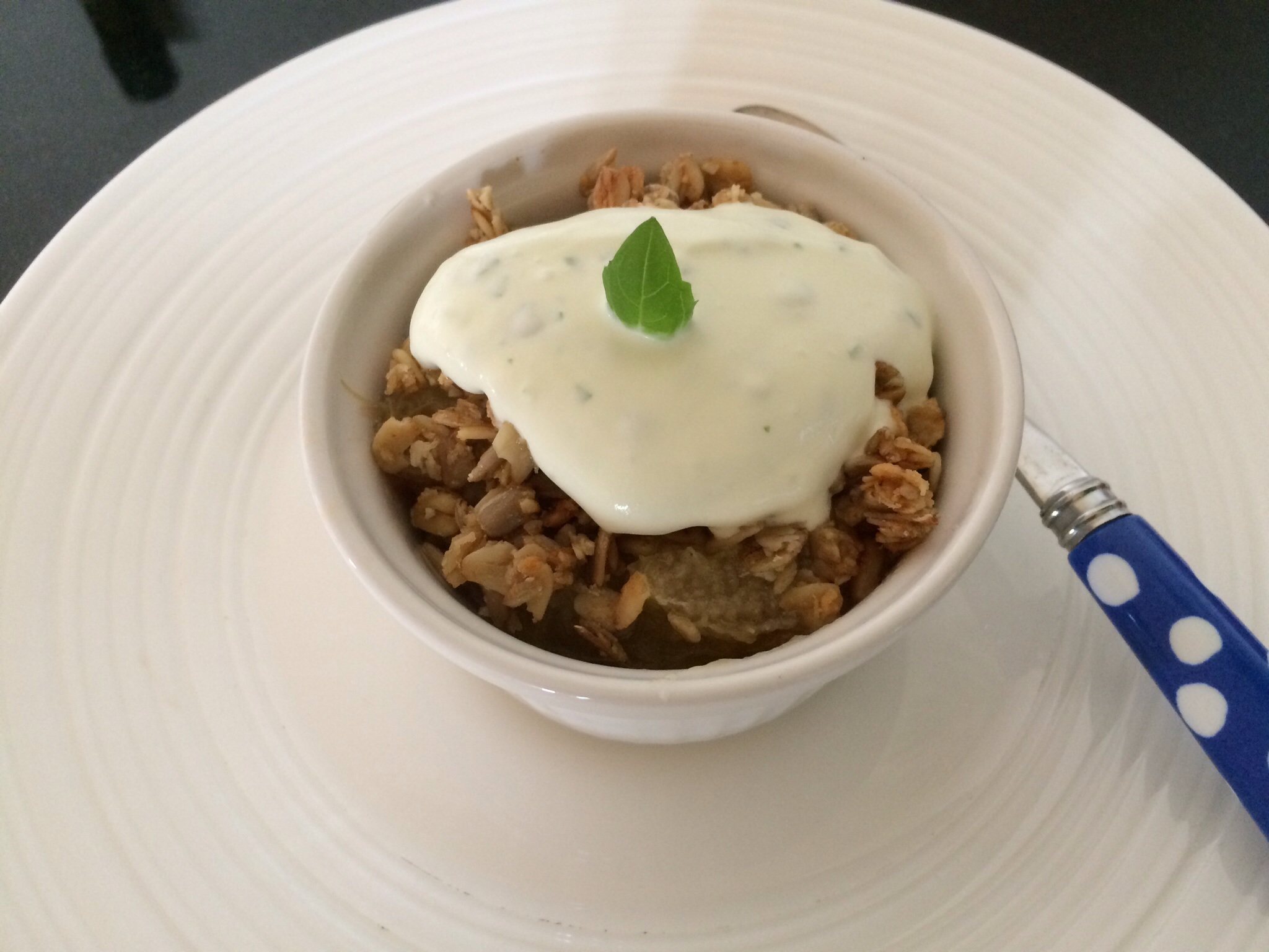 Still loving the fresh English rhubarb that’s in season I bought 4 sticks today to make a super quick crumble. I’m flavouring it with basil, the two go so well together, and making a basil cream to top it off. The crumble mix couldn’t be easier, and gives a bit of crunch to the topping. Flavouring the cream with a little basil adds even more summer flavour to the pudding.