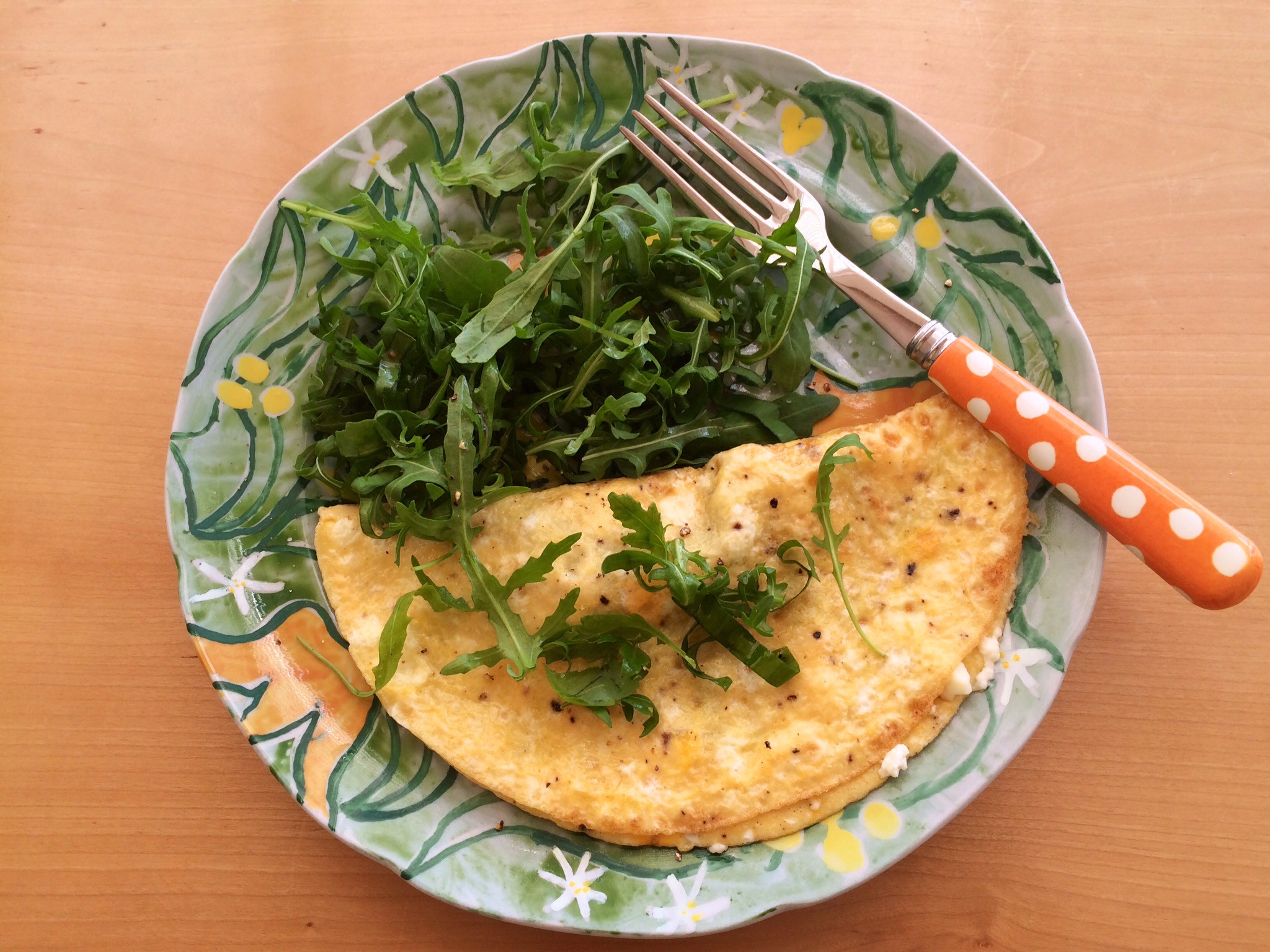Wild garlic is growing now. It has a gentle oniony taste and works well in this omelette. I’ve added a few chopped leaves to a simple rocket salad too which I’ve drizzled with olive oil and a little lime juice. Delicious!